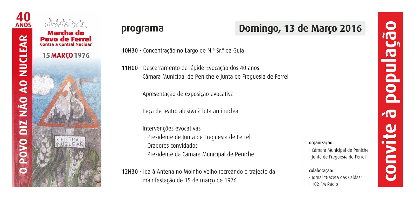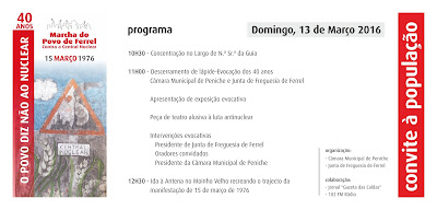 Há 40 anos, a Gazeta das Caldas, com a colaboração de incipientes grupos ecologistas de todo o país, com o apoio de meia dúzia de jornalistas, professores universitários, políticos, e com todos os cantores de intervenção, organizámos em Caldas da Rainha e Ferrel uma importante acção pública, contra a então, já periclitante, e perto de uma falha sísmica que não estava a ser considerada, central nuclear de Ferrel.