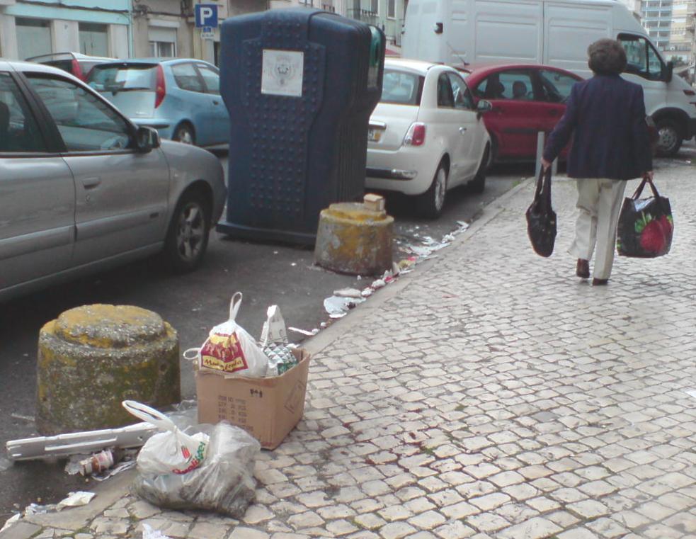 Como que "para compensar", podemos ver uma senhora que, como se fosse a coisa mais natural do mundo, acaba de colocar o seu lixo na berma do passeio.